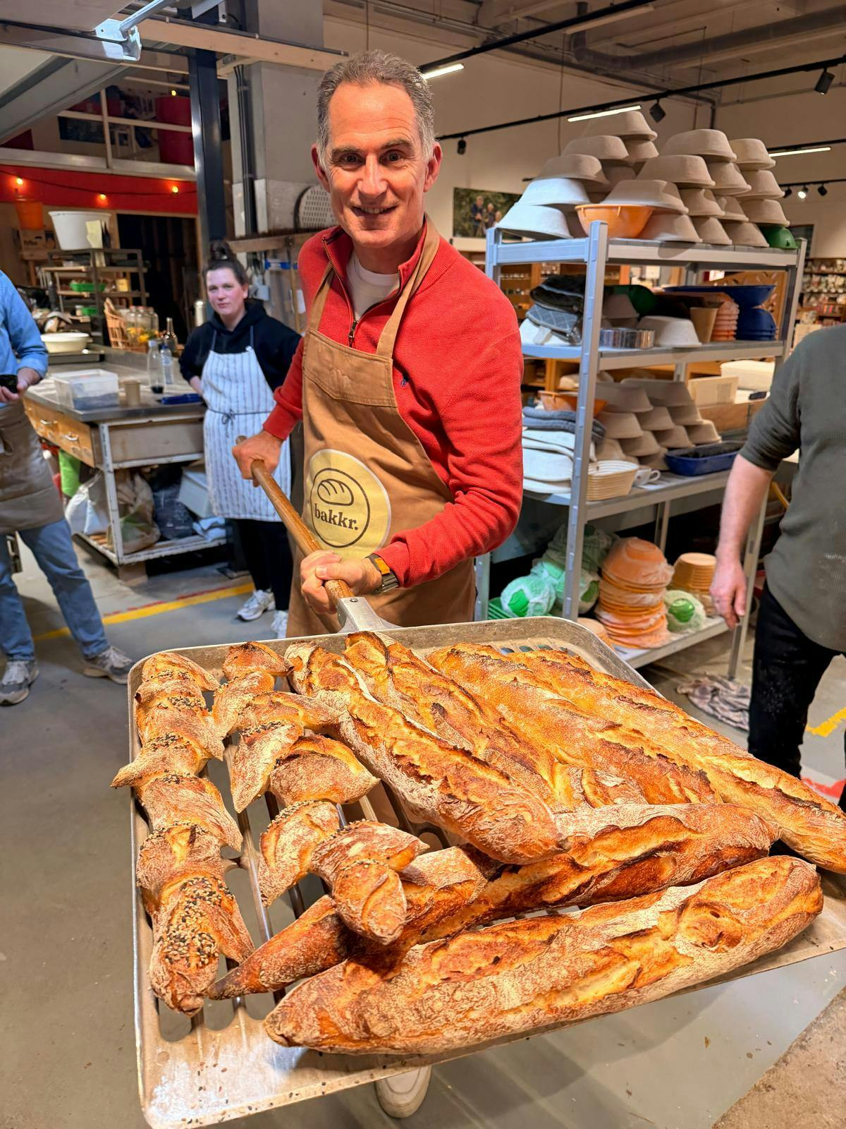 Prachtige workshop waarin Frederik heel relaxt uitlegt hoe je de lekkerste baguettes voorvormt, vormt en bakt. En ik heb nog nooit zulke lekkere baguettes gebakken. Ik ging met wel 10 broden naar huis.